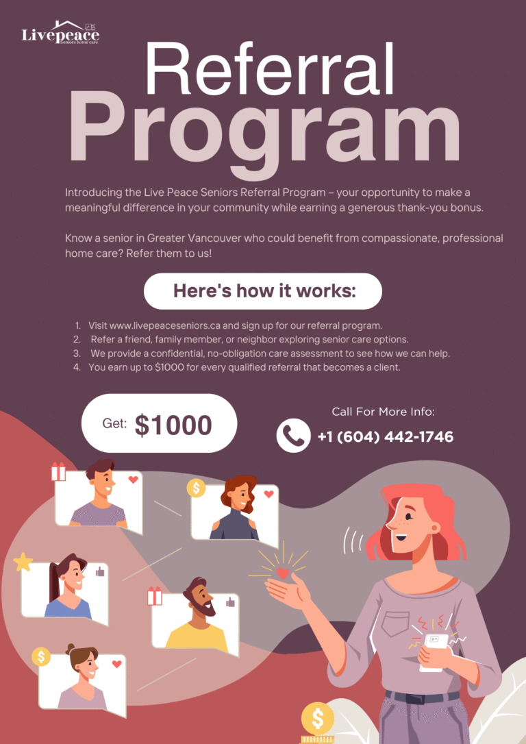 Introducing the Live Peace Seniors Referral Program – your opportunity to make a meaningful difference in your community while earning a generous thank-you bonus. Know a senior in Greater Vancouver who could benefit from compassionate, professional home care? Refer them to us!
